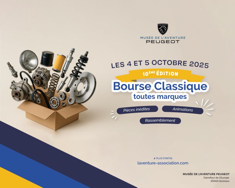 Per la 10ª edizione di questo appuntamento imperdibile per gli amanti delle auto d’epoca. Il Museo de L’Aventure Peugeot ha preparato un programma ricco di animazioni. Un weekend festoso, pensato sia per i collezionisti e gli appassionati di auto, che per le famiglie. Il Museo de L’Aventure Peugeot ospiterà la decima borsa di ricambi, accessori e documentazione tecnica per veicoli storici a 2 e 4 ruote (e youngtimer), di tutte le marche, nel cortile della sua officina il 4 e 5 ottobre. Il servizio ricambi de L’Aventure proporrà in vendita pezzi inediti di diverse marche, numerosi ricambi provenienti da vecchi stock e da nuove produzioni, oltre ad accessori e documentazione tecnica. Per i visitatori, l’accesso alla borsa sarà gratuito e aperto per entrambi i giorni, dalle 8:00 alle 17:00. Per chi desidera esporre, le tariffe per uno spazio senza allestimento sono di 3 €/ml per 1 giorno (a scelta) e 5 €/ml per 2 giorni. È necessario inviare un’email a musee@peugeot.com; è anche possibile scaricare il dossier di iscrizione qui.