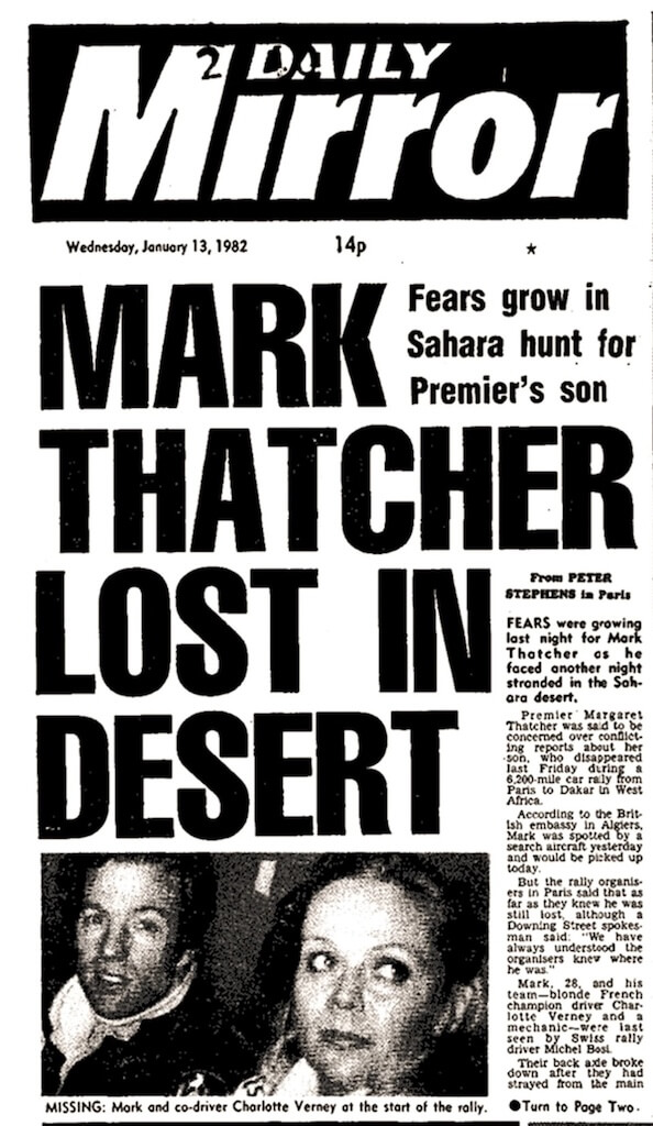 1982, una storia cattura l’attenzione del pubblico. Alla partenza della quarta edizione della Dakar comparve un nome inatteso: Sir Mark Thatcher, ventinovenne figlio di Margaret Thatcher, il Primo Ministro britannico. Pilota dilettante ma ambizioso, aveva già tentato la 24 Ore di Le Mans senza mai portarla a termine. Eppure, convinto che l’esperienza accumulata sarebbe bastata, si presentò il 1° gennaio 1982 sulla linea di partenza con una Peugeot 504 e—come avrebbe ammesso lui stesso—zero preparazione specifica. La prima settimana scorse senza particolari intoppi. Ma il 9 gennaio, il deserto presentò il conto. Dopo il cambio di uno pneumatico, Thatcher perse il contatto con il gruppo, imboccò una pista sbagliata e si addentrò da solo nel nulla più assoluto: le dune tra Algeria e Mali. Per tre giorni nessuno poté nemmeno dichiararlo ufficialmente disperso, come previsto dal regolamento dell’epoca. Quando le ricerche partirono, mobilitarono persino la RAF, in un’operazione che suscitò forte clamore politico. Il 14 gennaio, un aereo militare algerino individuò finalmente la Peugeot: Thatcher, la copilota Anne-Charlotte Verney e il meccanico erano vivi, ma si trovavano a quasi 500 km dalla tappa che avrebbero dovuto raggiungere. Li avevano salvati scorte abbondanti di viveri e il freddo dell’inverno sahariano. Per Mark Thatcher fu la fine delle avventure sportive e l’inizio di una carriera finanziaria costellata di scandali. Il caso più clamoroso arrivò nel 2004, quando fu accusato di aver sostenuto un tentato colpo di Stato in Guinea Equatoriale: evitò il carcere con una multa milionaria, ma venne bandito dagli Stati Uniti.