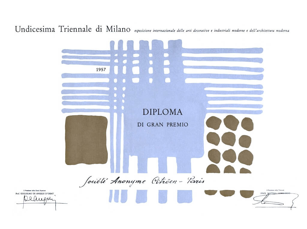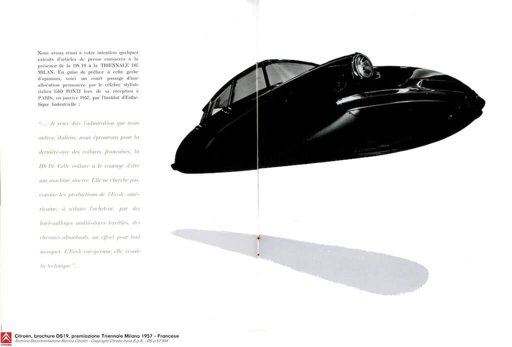 Tornando a DS ed al suo meritato premio, il 4 novembre del 1957 si inaugura la XI Triennale dedicata alla correlazione tra l’industria e l’arte con un’esposizione che riporta una selezione dell eopere più importanti in tal senso: Citroën partecipa con un’installazione dedicata a DS poggiata in un piedistallo come se invece che automobile fosse proprio un oggetto di design da esporre ed una serie di pannelli grafici che illustrano la ricerca dietro allo sviluppo degli elementi della carrozzeria: l’estetica di DS19, che ha già ottenuto il premio “Beauté France” nel 1956 ed è stata presente all’esposizione “Formes Françaises” di Zurigo del 1957, non è il risultato di uno studio convenzionale, ogni sua linea risponde a precise esigenze tecniche, le sue forme sono espressione di funzionalità e soddisfano i tre imperativi dell’uomo in movimento: confort, sicurezza, velocità.