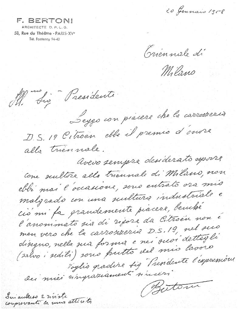 Flaminio Bertoni, designer fondamentale nella storia della Marca (tra le newsletter ne trovate una dedicata interamente a lui) è appena entrato a far parte della Hall of Fame di F.I.V.A. (www.fiva.org) durante una cerimonia tenutasi in occasione della fiera Auto e Moto d’Epoca di Bologna (ottobre 2025) allo stand ASI. Non andò altrettanto bene nel novembre del 1957 quando la Triennale di Milano assegnò ad Automobiles Citroën il “Doploma di Gran Premio” per DS, ritenuta opera d’arte industriale, dimenticandosi totalmente di citare l’autore di tale opera di arte e design ovvero Flaminio Bertoni che per tutta risposta inviò una lettera di puntualizzazioni direttamente al direttore della Triennale, quello scritto è arrivato fino a noi a testimoninza del carattere caparbio dell’artista Bertoni e potete leggerlo tra i contributi fotografici.