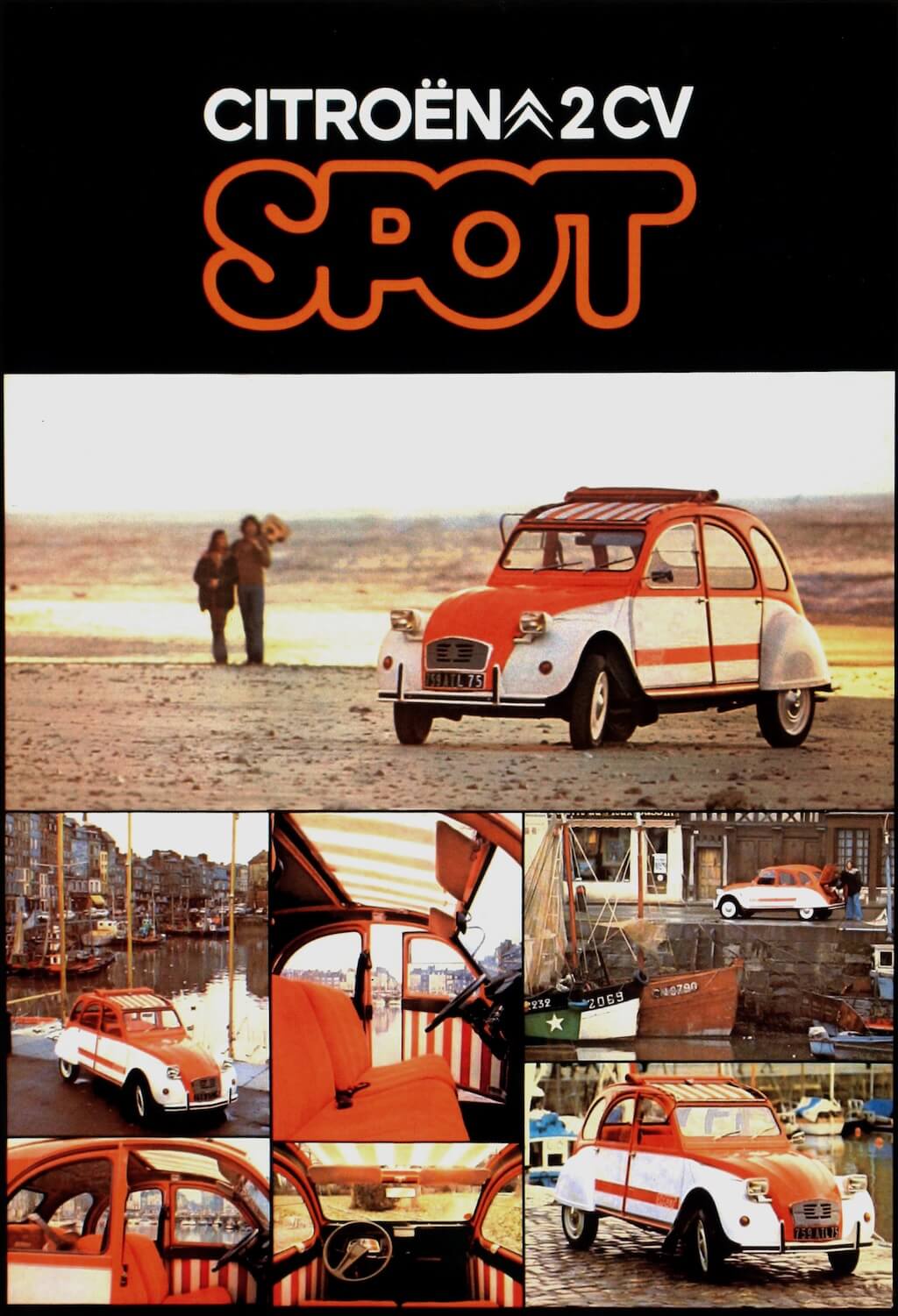 Ma torniamo alla nostra prima 2CV speciale: la livrea scelta è quella arancio e bianca ma il nome non va bene, in Francia è già registrato e non lo si può usare commercialmente, si opta quindi per SPOT, suona bene, è semplice, d’effetto e poi strizza l’occhio proprio alla tinta di arancio (AC329 Orange Ténéré) scelta per la carrozzeria… SPecial Orange Ténéré. Prodotta in serie limitata a 1.800 esemplari nella fabbrica parigina di Levallois, come base la classica 2CV4, con motore di 435cc (anche se in alcuni mercati fu usata la 2CV6), nella finizione più lussuosa denominata “Club”, con la strumentazione “di lusso” dell’AMI6, l’elegante volante in resina della Quillery, un rivestimento interno in tessuto arancione e dei pannelli porta molto vivaci, a strisce bianche e arancione, come lo speciale tendalino che consentiva di ripararsi dal sole a capote aperta, specifico di questo modello.