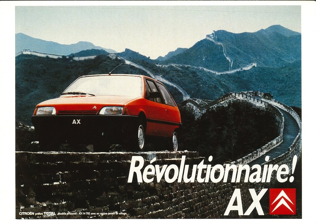 La nuova Citroën AX, presentata al Salone di Parigi del 1986, nasce, come progetto “S9” nel 1981 che si sviluppa fino ad arrivare alla vettura che tutti noi oggi conosciamo e che festeggia i suoi primi quarant’anni. Progettata con metodi di studio e calcolo all’epoca modernissimi, l’AX è, come la BX, una Citroën della new generation: agile, sobria, performante, nasce dai programmi di ricerca condotti con “Eco 2000” (prototipo dedicato agli studi sull’efficienza energetica): riduzione delle resistenze all’avanzamento, ottimizzazione dei motori, riduzione delle masso e consumi contenuti. AX è una berlina tre porte, trazione anteriore, compatta (lunga 3,5 metri) dalla linea piacevole, moderna e aerodinamica con un coefficiente di penetrazione dell’aria CX di 0,31 (le coeve Fiat Uno avevano un CX di 0,33 e le vetture di fascia simile degli anni ‘80 avevano mediamente un CX compreso tra 0,45 e 0,55). Il ridotto ingombro del vano motore permette di offrire una grande abitabilità: cinque posti, terza porta, allestimenti interni, fanno della AX una vettura piacevole e attenta al benessere degli utenti. AX è equipaggiata con un gruppo motore completamente nuovo, disposto trasversalmente in posizione verticale, con cambio a 4 e 5 rapporti (secondo le versioni).