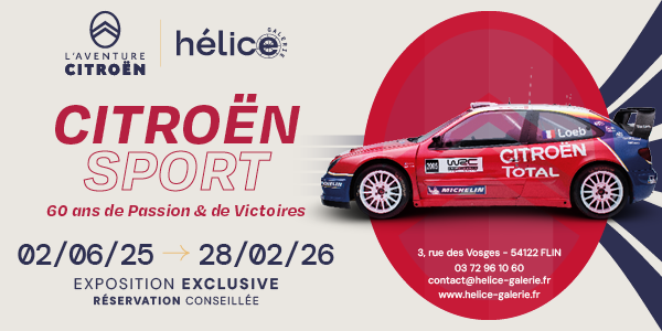 In uno spazio unico di oltre 1.100 m², Hélice Galerie a Flin ospita dal 2 giugno 2025 una retrospettiva inedita che ripercorre la storia sportiva della Marca al doppio Chevron: dai primi veicoli preparati e iscritti ufficialmente ai rally nel 1965 e dalla creazione del reparto Competizioni Citroën, fino ai trionfi nel WRC e nel WTCC negli anni 2000 e 2010.